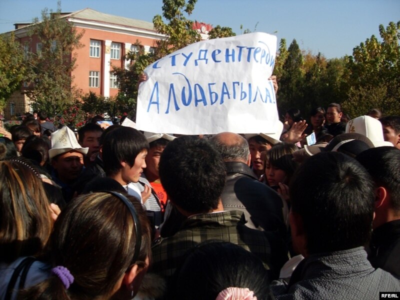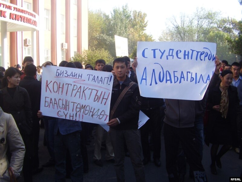 Окуу жай алдына чогулган студенттер «Студенттер алданбайт», «Талаптар аткарылбаса, ректор кетсин» сыяктуу ондогон плакаттарды көтөрүп турушту. Алар ОшМУ жетекчилиги министрликтин буйругусуз эле келишим акыны жыл санап кымбаттатып жатканын, аталган окуу жайда башка ЖОЖдорго салыштырмалуу жатакана баасы да эки эсе жогору экенине даттанышты.